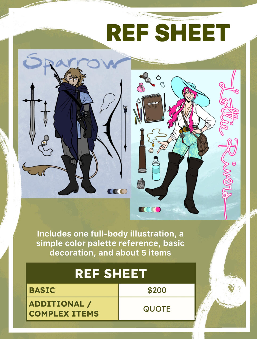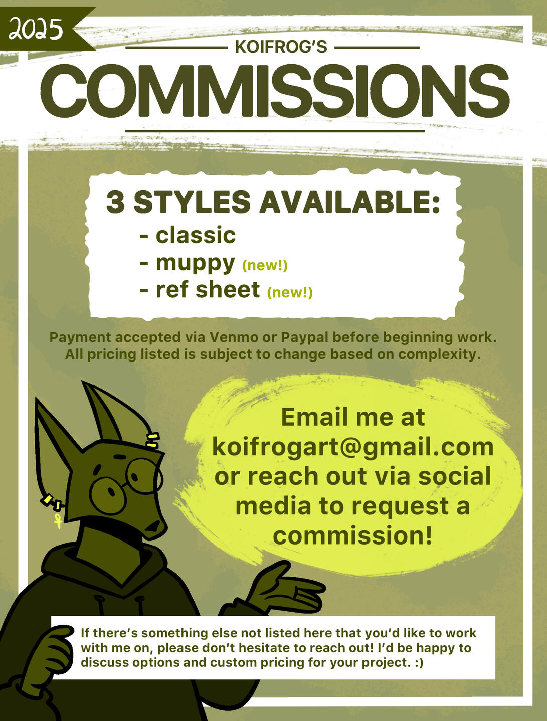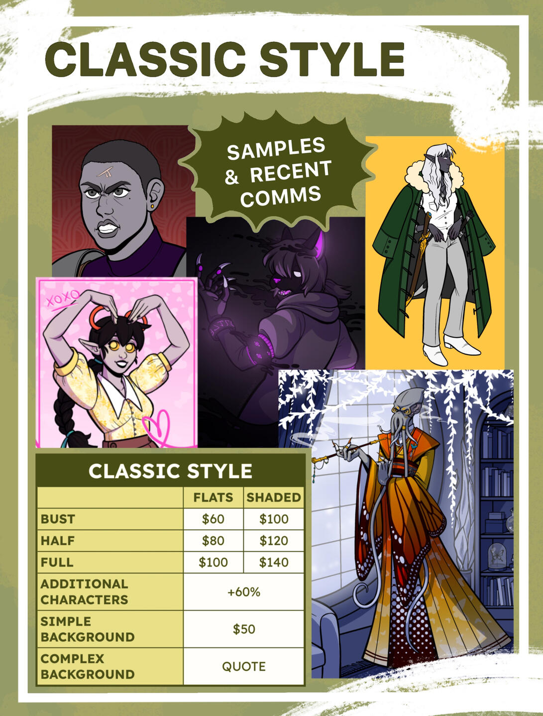 TERMS OF SERVICE: When you commission me, the final product is yours to use as you see fit! I ask that you credit me where possible, and if asked for the artist who created the piece, you refer them to me.COMMERCIAL USE: If you intend to use your commissioned piece for any commercial use (book covers, advertising, logos, etc) please let me know right away before work begins. I require an additional fee to be paid for commercial use of my work. Please reach out to me for more details.ETA: Depending on the piece, commissions will take anywhere from a few weeks to a few months to complete. If you would like your commission completed by a certain date, please let me know right away so I can determine if I’ll reasonably be able to meet your deadline, and if so, plan my schedule to make sure I have your piece done in time.PAYMENT: Payment will be accepted via Paypal, Ko-Fi or Venmo before beginning any work. If needed, I am always willing to work with you to establish a payment plan! Tips are always appreciated but not required.